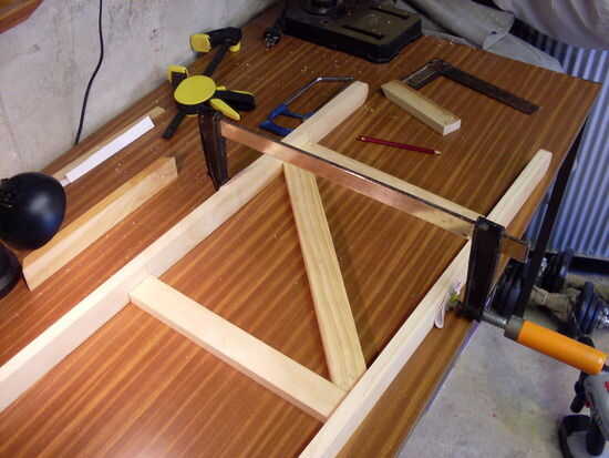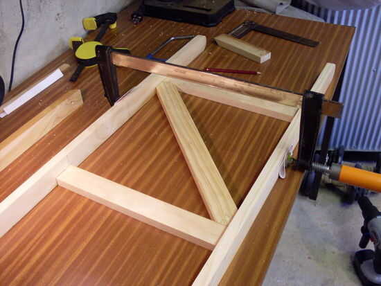 Pegué los listones superior sobre los soportes del dos a la vez, separación de los listones con un pedazo de madera contrachapada para que ellos eran todos uniformemente espaciados.