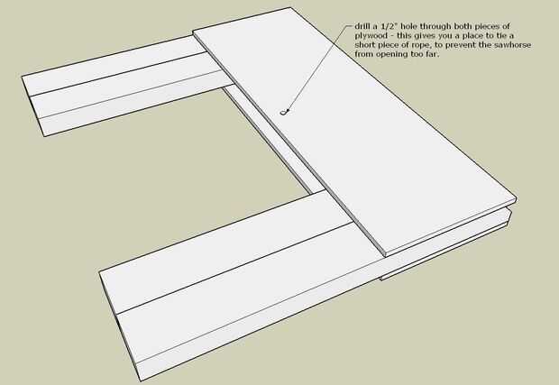 perforaciones para fijar la cuerda de parada (no llamo la cuerda, porque me daba hasta pereza averiguar cómo dibujar un nudo con Google Sketchup!) sólo tome un pedazo de cuerda sobre un pie de largo, palillo a través de los agujeros, luego haga un nudo en cada extremo (o atarla como yo lo hice en la foto de caballete doblado tendido en el suelo, en la primera página).
