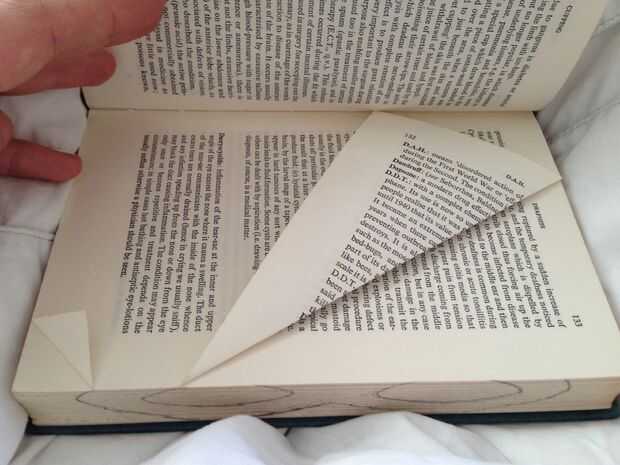 Lo hice siempre con un pliegue de 45 grados como su fácil alinear con el texto del libro. Ejemplo de foto izquierda.