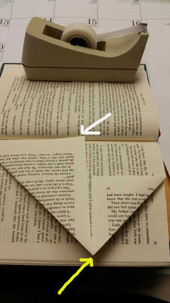 Comenzar a doblar cada una de las marcas del dos lápiz en cada página en ángulo recto (90 º) en uno hacia el otro. No te preocupes si la parte posterior del doblez no es perfecta (flecha blanca); es la precisión de la parte delantera de la tapa, donde marcó los puntos, que crea el diseño (flecha amarilla).