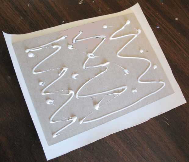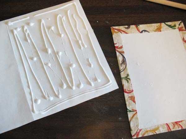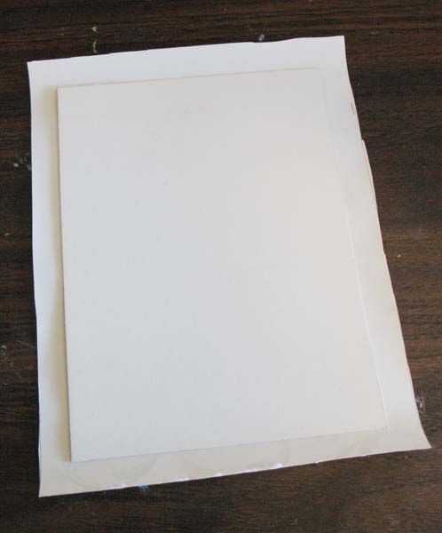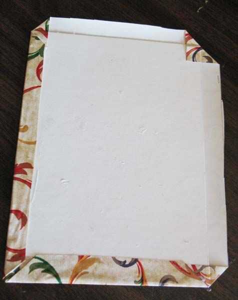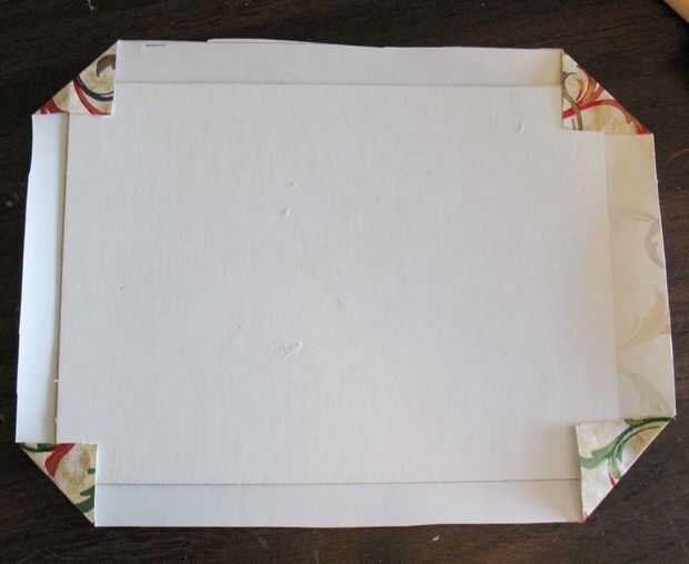 Pegue la cartulina en el centro del revés del papel, presionando firmemente. Poner una gota de pegamento en cada una de las esquinas de la cartulina, luego doblar las esquinas del papel hacia abajo, haciendo ángulos de 45 grados agradable. Luego pegue los bordes laterales del papel de embalaje de la cartulina.