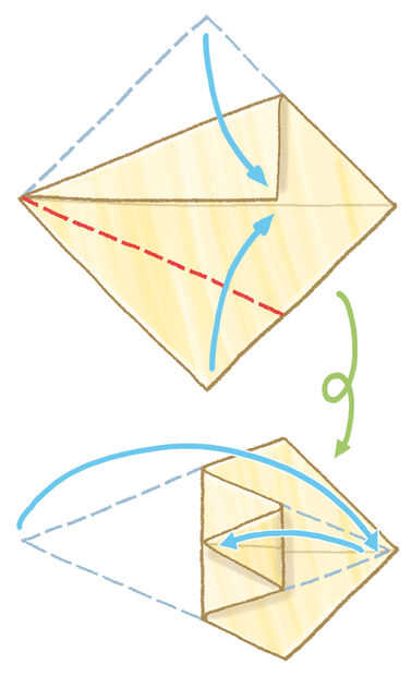 Doblar las esquinas superior e inferior hacia el interior para satisfacer a lo largo de la línea central. Esto será una forma hacia los lados de la cometa. Voltea la figura y doblar el largo a la izquierda para la derecha, luego doblar el punto en que el borde doblado, como se muestra.