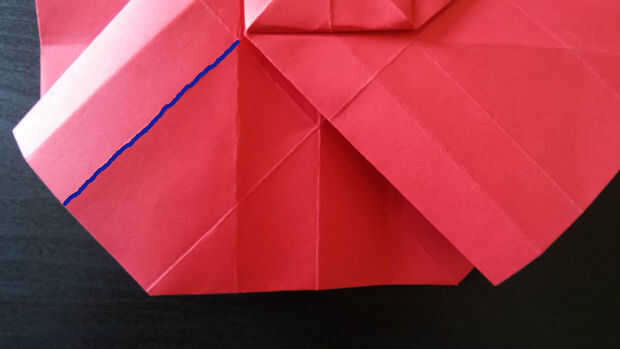 1. anuncio del pliegue en cada esquina y va directamente hacia afuera en diagonal desde el pliegue. (línea azul) El primer paso es pellizcar que doblar hasta que se forme un triángulo grande