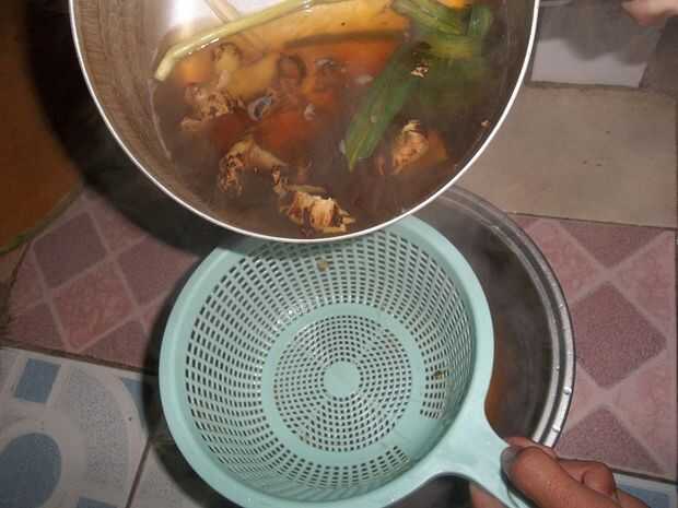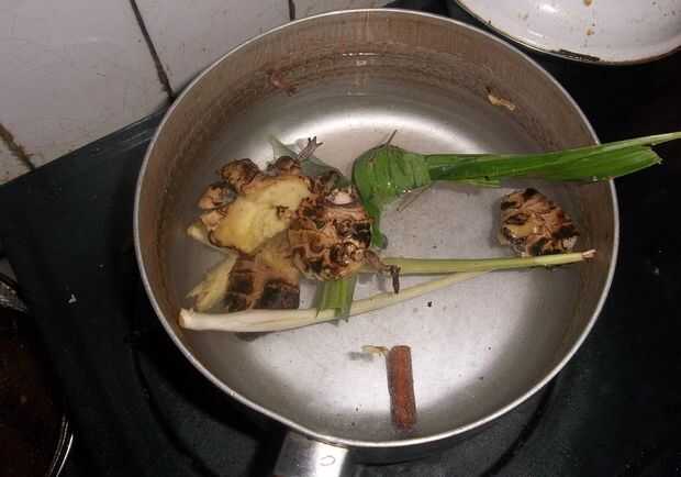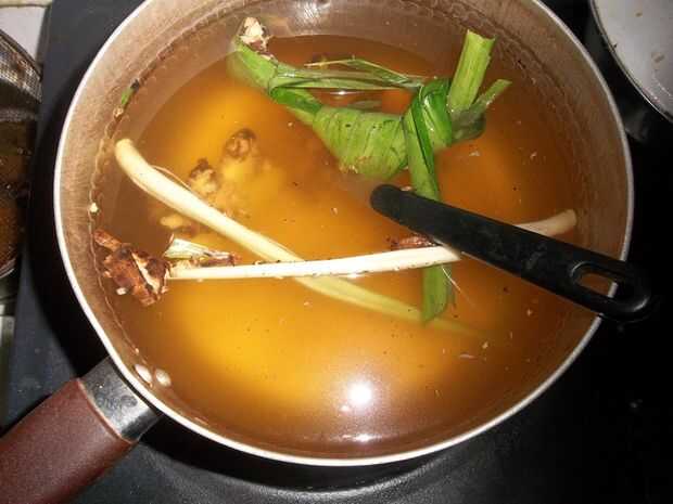 • Hierva el jengibre, azúcar marrón, limoncillo, canela, clavo de olor y hojas de Pandan a 1, 5L de agua con fuego pequeño en ebullición y fragante. Luego filtrarlo.