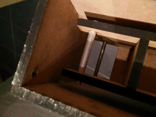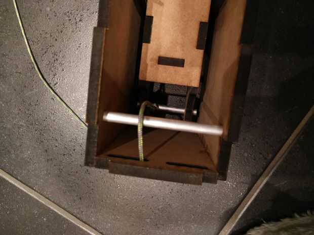 Utilizamos cuerdas para tirar para arriba de la cajita, utilizamos tubos de 6mm como levantar mechanismn. ubicar las cuerdas para que comienzan en la parte inferior y suben a la tubería de estática y de allí a true la abertura en la caja interna.