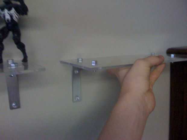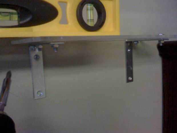 Este es el paso más importante! Si usted alineados sus soportes correctamente, la plataforma debe mentir plana contra la pared. Asegúrese de que esté nivelada y luego atorníllelo en su lugar. Si usted necesita los tarugos, siga las instrucciones en el paquete. Tire el estante un poco para asegurarse de que es resistente, luego paso atrás, limpie su frente y cabeceo de la cabeza. Ahora ponga su basura en él y disfruta!