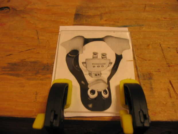 bloqueo en la broca fina talla en su dremel. Coloque la fotografía en el plexiglás y sujete todo el conjunto hasta su escritorio. encender tantas luces como sea posible. sentarse y asegúrese de que no se distraiga. Ponga cualquier equipo de protección que usted necesita, por ejemplo (no es realmente necesarios) los defensores de oído y gafas de seguridad (una buena idea)