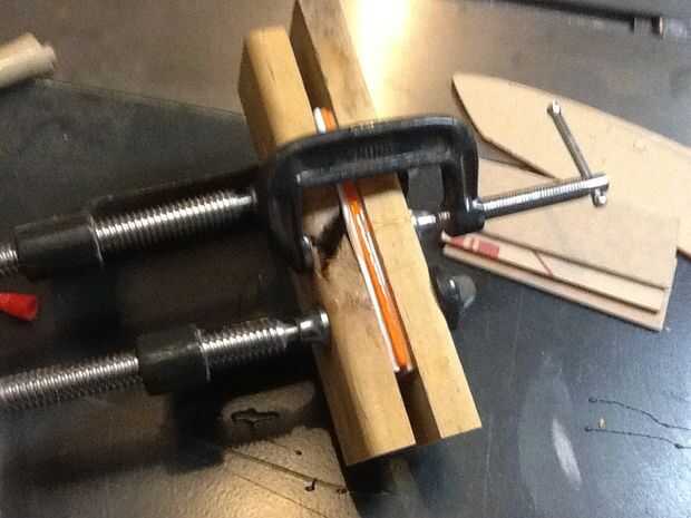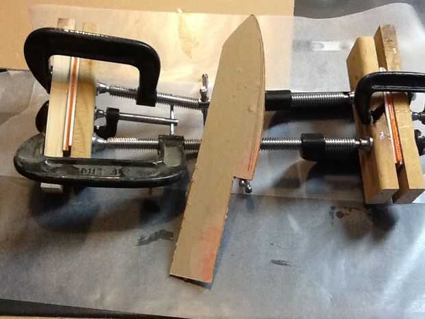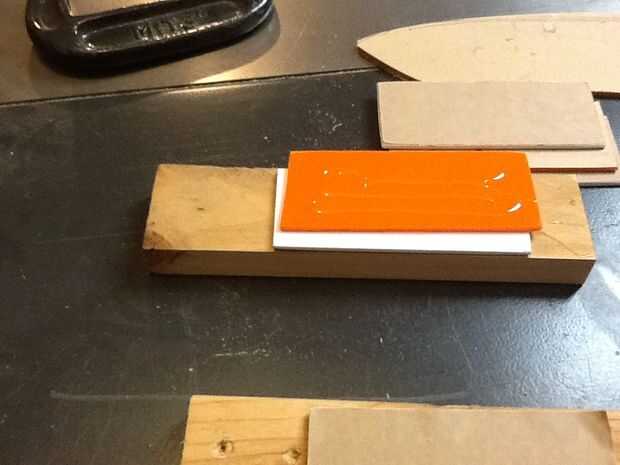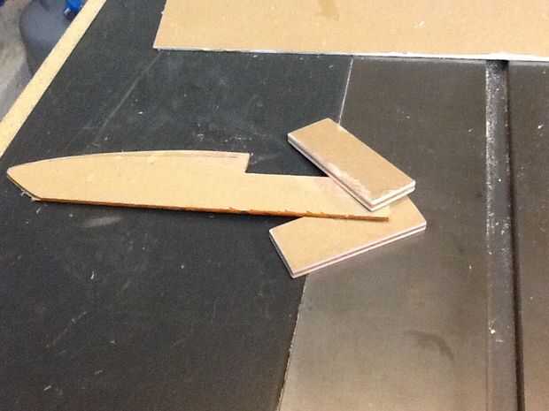 Ahora, para facilitar las cosas, cortar todas las piezas para la manija a un tamaño uniforme para facilitar el trabajo con. Dibujar el contorno de la cuchilla sobre la cuchilla de vidrio plexi y recuerda que la hoja continuará a través del mango entero. Ahora pegue uno de los desechos entre otras dos piezas de scap, para hacer tres capas chatarra sándwich. Hacerlo dos veces y les deje reposar...