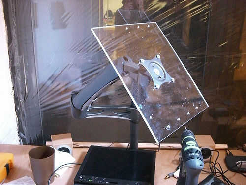 Hacerlo mediante sus cuatro tornillos de 1" con arandelas en los extremos y una tuerca de cada una. Asegúrese de que éste es ajustado. El plexi sólo cuesta 20 dólares pero si la computadora portátil se le probablemente no será muy feliz.