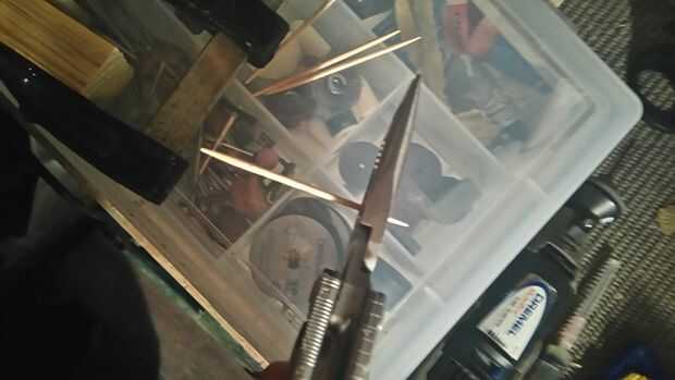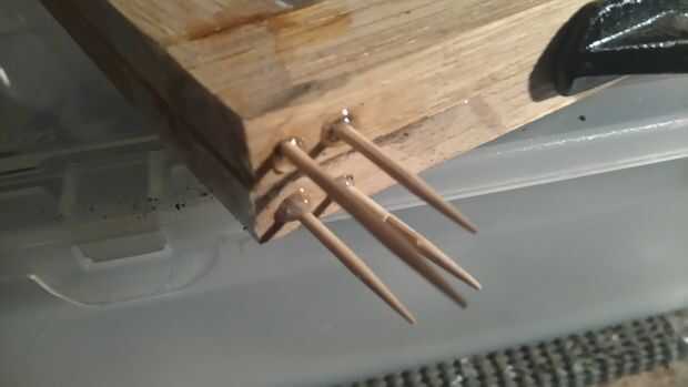 se hacen orificios de 2mm para palillos de dientes. Esto hace un vínculo más fuerte y se ve lujo así! Se cortan los extremos conificados del palillo de. Se utiliza el mismo pegamento para adherir todos juntos. Después de secado el 'palillo-residu' se corta de una plancha vio.