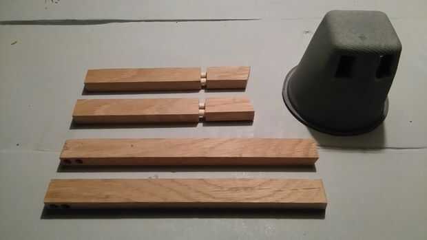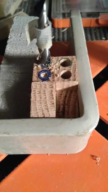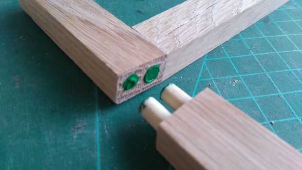 Para dar cabida a la opción dual-posicionamiento usé circular madera de pino de 6mm de diámetro. Hice los taladros por medio de un taladro de columna. Para hacer un partido perfecto en sentido contrario usé pintura a base de agua para hacer marcadores para el siguiente conjunto de perforaciones. Encolar los tacos en las piezas largas de 125mm de madera.