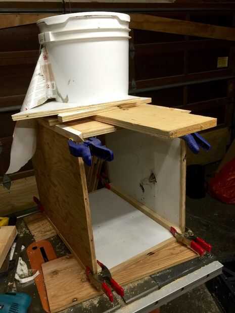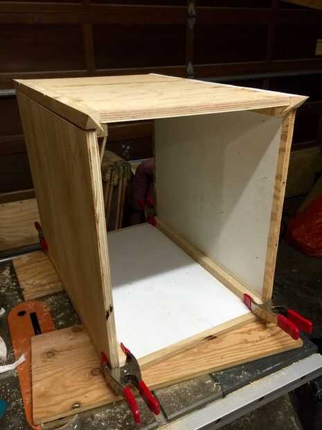 Nota que absolutamente no tienen bastantes hojas de madera contrachapada para los seis lados, así que me uní a dos piezas más pequeñas para uno de los lados. Una de las ventajas de no ver el interior de la caja es que yo sólo pude bofetada una costra fea grande en el interior para unir los dos trozos.