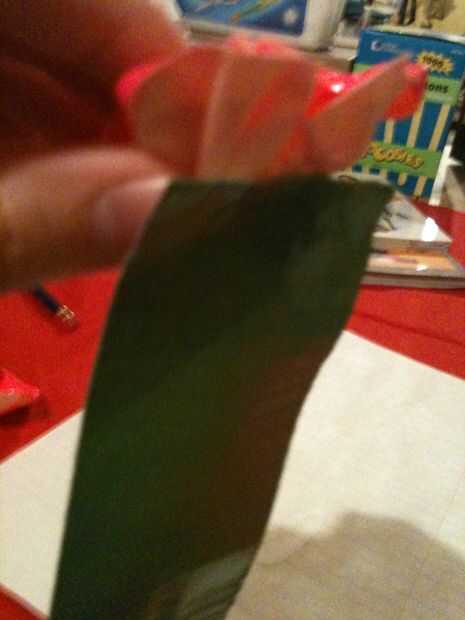 Para hacer el tallo, comenzar por rasgar la cinta verde a tiempo le gustaría. A continuación, pegarlo en la parte inferior de la flor. Primero doble un lado de la cinta completamente hacia abajo, uniforme y plana. Luego doblar el otro lado en el centro.