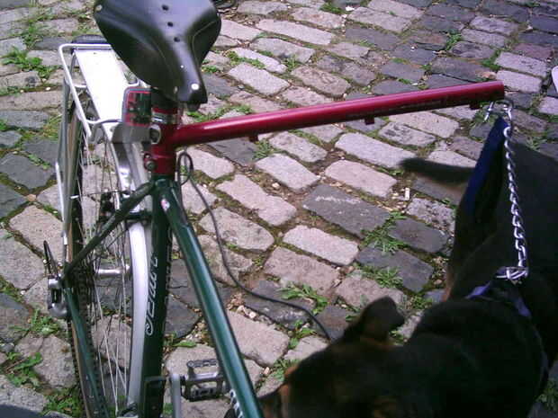 La cadena debe ser lo suficientemente corta como para detener al perro corriendo hacia los lados en su bicicleta, pero no tan corto el perro está siendo levantado del suelo.