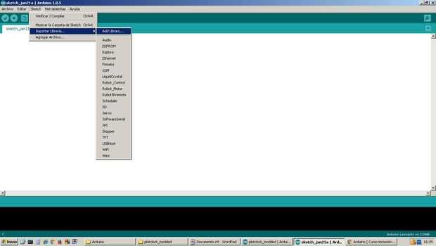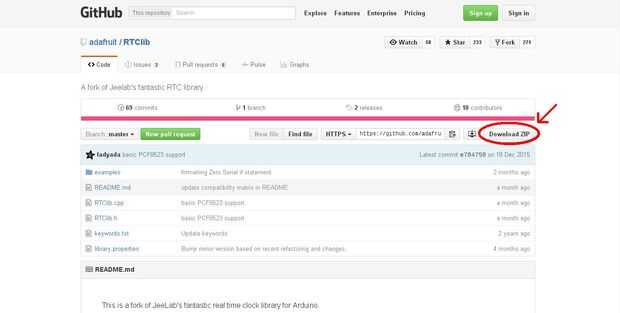 Biblioteca RTCLIB: https://github.com/adafruit/RTClib (es necesario cambiar el nombre de. ZIP que se descarga desde RTClib master.zip un RTClib.zip).