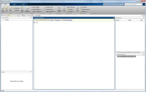 Para empezar, la computadora que está usando debe encendida y conectada a. Desde el escritorio haga clic en el botón de windows en la esquina de mano izquierda inferior (windows versiones vista, 7 y 8, botón de start para las versiones anteriores) y buscar el programa MATLAB. Haga doble clic en el texto "MATLAB R2013a," para abrir el programa. Si no encuentras el programa a través de la búsqueda de que la computadora no tiene instalado MATLAB y usted tendrá que utilizar un equipo diferente. El programa tendrá un momento para cargar, pero cuando lo hace, verá la ventana de inicio en la foto superior.