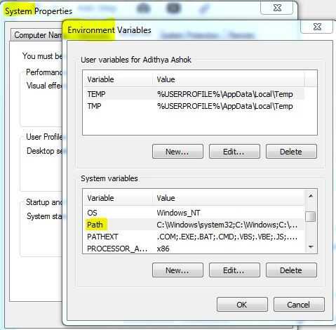 Está bien. Después de descargar Python, agregarla a la Variable PATH del entorno, utilizando esta ruta - Panel de Control > sistema y seguridad > Sistema > Configuración avanzada del sistema > Variables de entorno > Variables de sistema > ruta.
