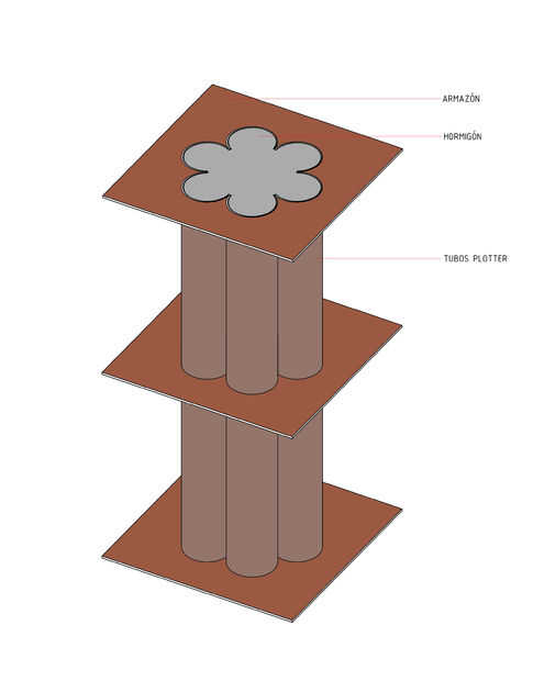 Básicamente deben unirse los tubos plotter previamente cortados, selar las uniones con cinta adhesiva para evitar fugas de la mezcla, montar el enviando para elaboró la forma final del pilar y rigidizar el moldaje, ubicar fierros estriados en el centro de las circunferencias de filtro-regulador, aplicar mezcla de hormigón.