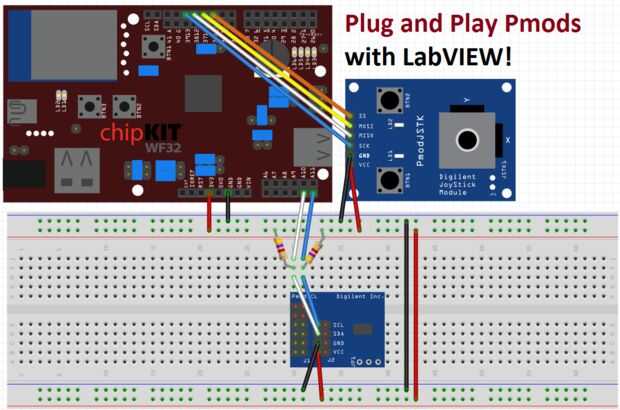 Esta demostración utiliza LabVIEW, LINX MakerHub de LabVIEW, chipKIT WF32, 4,7 k resistencias (resistores de pull-up) 2 x y el Pmods mencionado arriba. Las resistencias de pull-up se utilizan para tirar de las líneas SCL y SDA de datos para la comunicación I2C. Si no estás seguro de cómo conectar estas resistencias, revisa este Instructable que contiene una descripción de cómo conectar las resistencias de pull-up.