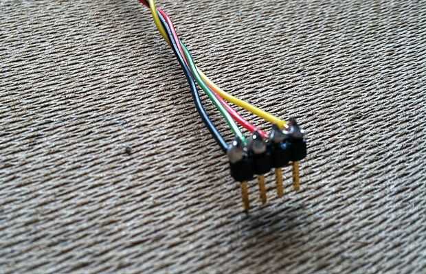 1. los jefes de estado del sensor conectarse el estado del 4 sensor LEDs en el panel frontal de la pila. Para crear esta cabecera, utilizaremos alfileres D3, D9, D10 y D11, que corresponden a entradas del sensor A, B, C y D respectivamente. Esto requiere de un jefe del pin individual (D3) conectado al LED A, y un cabezal de 3 pines (D9, D10, D11) conectado al LED B, C y D. Para hacer la cabecera, colocar los cables desde el panel de la pila, medida corte los cables y soldar a los pines del cabezal.