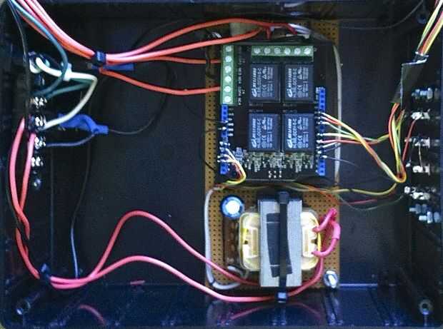 4. conectar el circuito de salida a la protección de relé conectando la fuente caliente y las 4 pastillitas de salida a través de las conexiones del relé (terminales). Primera medida, corte y tira un cable entre el caliente tira terminal y el conector NO1 en el escudo de relé. Segunda medida, de corte y desforre de cables cortos de NO1 y NO2, NO2 y NO3, NO3 a NO4. Ahora la línea de agua caliente se conecta a todos los interruptores de relé. En segundo lugar, Conecte cada uno de los cables de salida caliente (roja) panel a cada uno de los terminales COM1-4 en el escudo de relé, COM1 a salida A, COM2 a toma B, COM3 a salida C y COM4 a la salida D. Esto completa el cableado de alta potencia para el escudo.