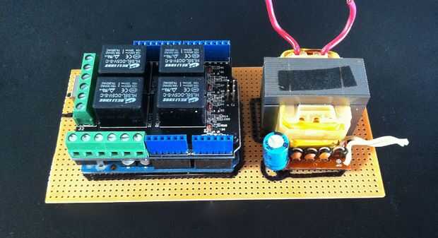 Compruebe las especificaciones, que quiere asegurarse de que su oferta es hasta el trabajo. El Arduino relé escudo y LEDs pueden ser alimentados por tan poco como 5V, pero recomendamos 9-12 V y al menos 500 mA para garantizar un funcionamiento confiable y duradero. También asegúrese que la salida de la fuente de poder 9-12V DC, no AC. En esta foto se puede ver esta fuente de verruga de la pared consiste en un transformador, puente rectificador y condensadores de filtro; todos estos son necesarios para suministrar una fuente decente. Si es posible, probar la fuente antes de que usted tira hacia abajo - si usted está comprando una nueva fuente de buscar uno con la clavija de 2,5 mm compatible con la placa Arduino y enchufe en para asegurarse de que funciona; también puede utilizar al conector en la construcción final.