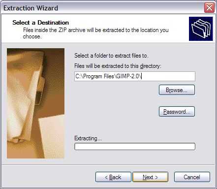 Haga clic derecho sobre el archivo y seleccionar Extraer todos... y el Asistente de extracción de Windows se abrirán. En el campo donde puede especificar un directorio para extraer los archivos, Windows es un poco lo suficiente como para sugerir la ubicación C:\Program Files\GIMP-2.0\gimp-pspi-1.0.5.win32 --eliminar la última parte de este camino y cambiarlo para leer a C:\Program Files\GIMP-2.0 y haga clic en "Siguiente". (Lo esencial es, extraer el contenido de la carpeta en el directorio GIMP, no en su propio directorio).