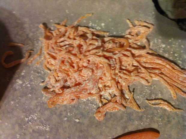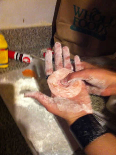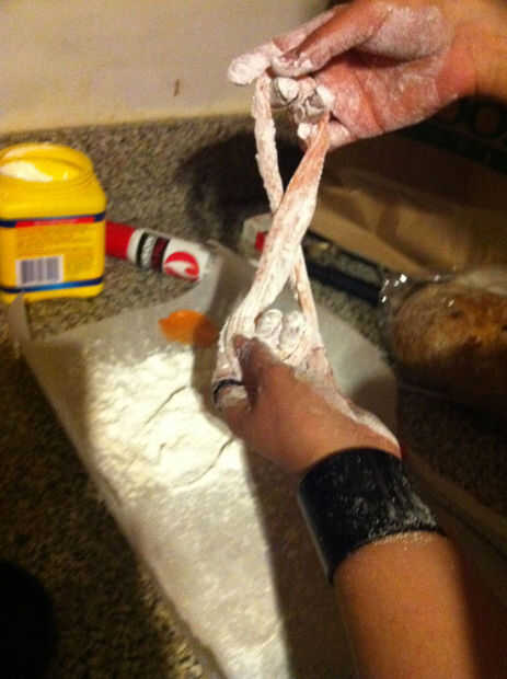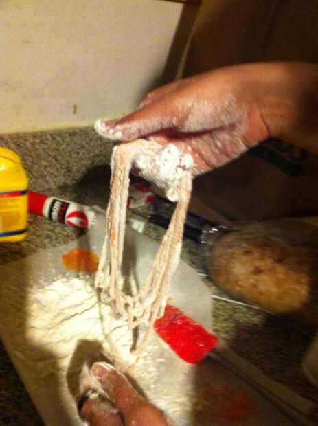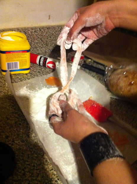 A partir de uno de nuestros discos de azúcar a temperatura factible (recuerda, desde el paso 4 de este ' Ible), hágale un agujero en el centro con el pulgar y estirarlo hacia fuera. Tener cuidado porque el caramelo parece propenso a desgarro si tienes en su lugar, tome lenta y suavemente Hale el caramelo en un anillo más grande. Siguiendo el método en el Instructable antes mencionado, nos tire y gire y tire y gire, sumergir los hilos de azúcar en almidón de maíz o arroz harina para evitar que les peguen.