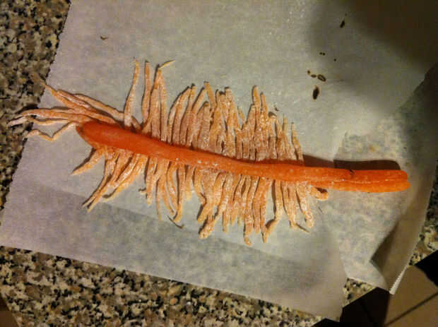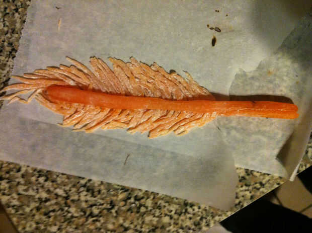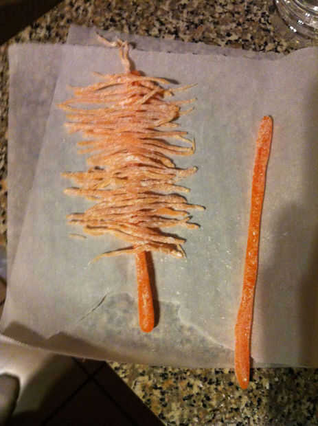 Romper los hilos en pedazos de 3 pulgadas de largo y lugar, centrado, a lo largo de la parte hacia arriba-y-plano de uno de sus ejes medio recién hechos Coloque el otra mitad del eje en la parte superior y suave con los dedos. Extienda la harina o cadenas de caramelo recubierto de almidón en la dirección opuesta de la punta de escritura, en forma de pluma agradable, apropiado.
