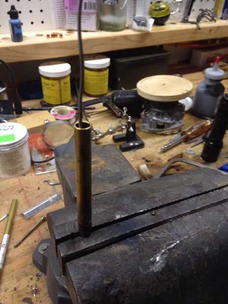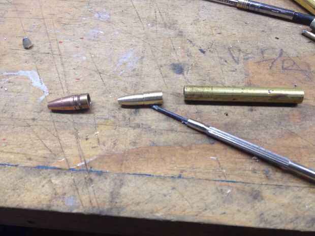 Porque la punta de latón es muy suave, rechazó un inserto de latón, que cabría dentro de la punta de la bala. Cuando entra, le puse las tres piezas juntas (segunda foto) y los soldados.