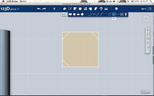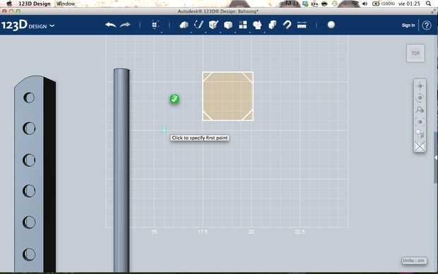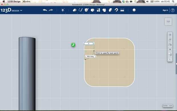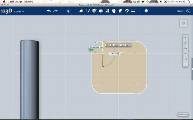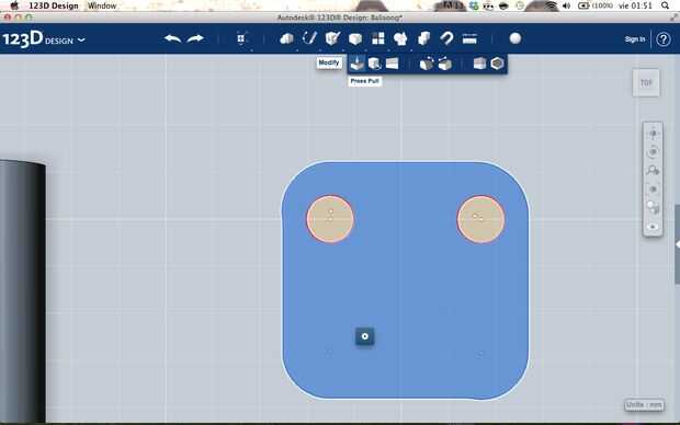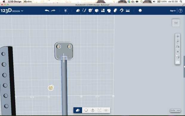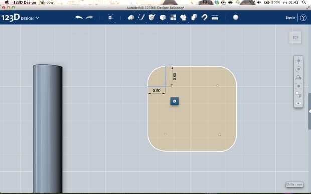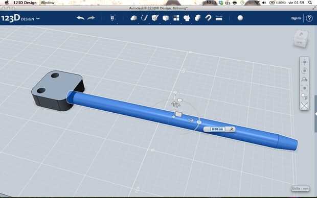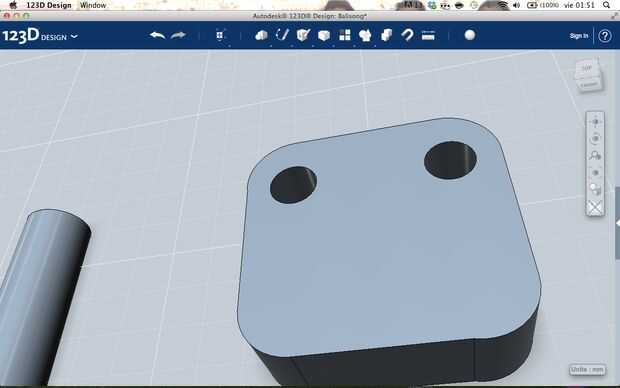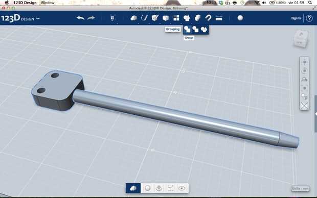 Ahora vamos a hacer la parte que unirá cada pieza que hemos construido. Crear un rectángulo de ancho 2,6 y 2,5 de altura. Utilice la herramienta spline para hacer líneas para cortar los bordes. Ahora utilice la herramienta de ajuste situada en el dibujo y haga clic en las líneas que forman los bordes para que la herramienta será eliminarlos. Ahora utilice la herramienta spline para hacer bordes redondos alrededor del rectángulo, basta que haga clic y mantenga en un punto e ir a otro y luego suelte. Ahora que tienes un rectángulo con los bordes redondos, vas a la herramienta de tira otra vez y horizontalmente una línea de 0,5 cm y otra de 0,6 verticalmente. Ahora haz un círculo de 0.5 cm donde se intersectan las líneas que usted acaba de hacer. Hacer exactamente lo mismo en el otro lado del rectángulo. Continuación, seleccione el rectángulo sin los círculos y extruyelo. Tipo de 0,9 cm y debe tener el rectángulo con 2 agujeros. Ahora toma la pluma y con la herramienta mover la coloque en el centro del rectángulo y luego la empuje hacia el rectángulo para que la pluma sea dentro del rectángulo. Intente colocar el extremo de la pluma casi tocando el extremo del rectángulo. Ahora selecciona ambos y agruparlos (ir al icono de círculo/triángulo/cuadrado y selecto grupo).