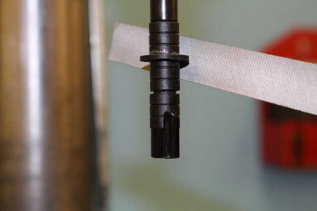 Nota: había montado directamente en el portabrocas, pero estaba preocupada de que golpearía el taladro con el archivo, por lo que arrojó la pluma en su lugar. Si haces esto, tenga mucho cuidado! Si se rompe el lápiz vas a arrepentir. La tinta hará una raya de tinta en la pared de su tienda! Esto es una forma de tecnología de dar vuelta abajo de la lavadora a un diámetro realizable. Ya lo sabes por qué elegí una arandela de fibra! No habría funcionado con un metal. Además, mi preferencia es no para que el titular coincida el diámetro de la pluma de HP. Se sientan sin apretar en el soporte, y que parece menos preciso para mí. Así que me volví hasta que encaje perfectamente en el soporte y no caerse.