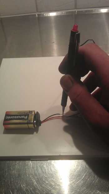 Si todo se hace correctamente el LED se enciende cuando se tiene la punta en + y la abrazadera en-. Nada debe suceder al invertir. Si no funciona, asegúrese de que usted no rompe nada utilizando demasiada fuerza cuando se pone la pluma juntos.