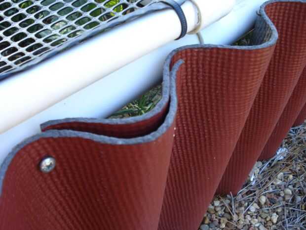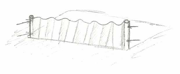Se construirán los muros de las tejas. Mida cuántas tendrá que hacerlo todo. Asegúrese de tener en cuenta una superposición al conectar dos juntos, he usado 1-2 golpes como una superposición. Para las esquinas, conducen un pedazo largo de 1 1/2" tubo de PVC como un juego, deben ser unas 12 pulgadas más largo que la altura de las paredes. Pero les por lo que son aproximadamente 2 pulgadas menos que la altura de las paredes. Cortar los azulejos de material para techos con el cuchillo; tardará varias pasadas antes de que usted haga a través de todo el camino. Cuando tengas las piezas cortadas, fijar en el suelo y utilice los tornillos de 1/2" para conectar cualquier traslapos juntos (sólo necesita usar 2). Luego coloque las paredes completas en hoyo que hiciste previamente, las partes inferiores de las paredes bajo el nivel del suelo. Coloque * ambos extremos a las estacas de PVC en las esquinas. Hacer esto para todas las paredes.