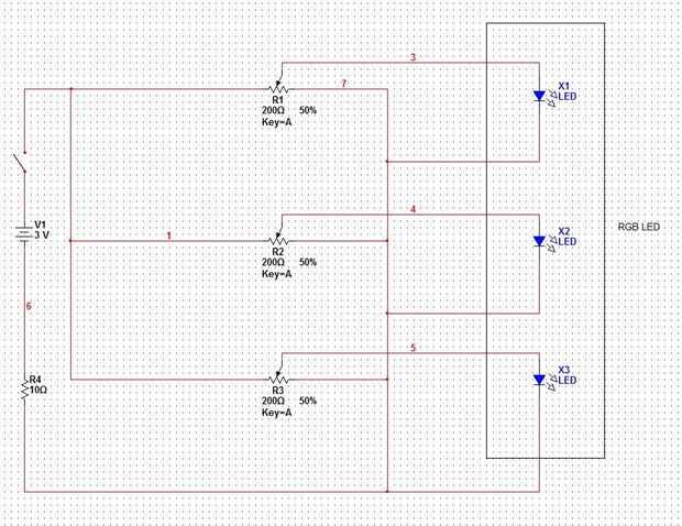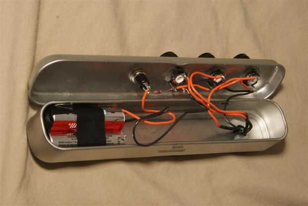 El esquema es inferior, y puede ser por cable punto a punto con ningún PCB requerido. El pin central (la armadura) de cada maceta está conectado al LED + de cada uno, y los otros dos pasadores en la olla se conectan al + y - de la batería, respetuosamente. -Cátodo pata del LED va a tierra.