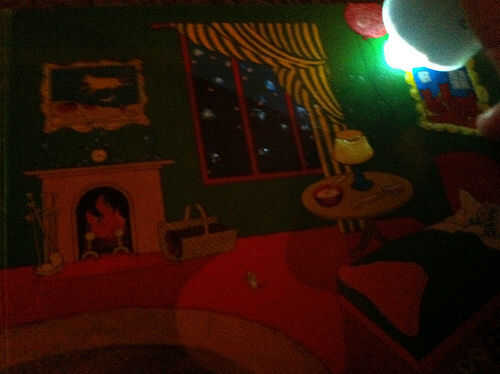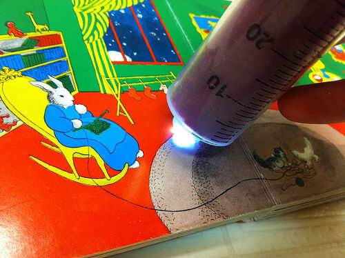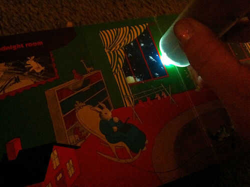 Quería un libro que tenía elementos que brillan intensamente, junto con una luz que se ilumina solamente al presionar la punta contra la página. No he encontrado ninguno, así que les hice yo mismo. Usé un libro que ya tenía, Goodnight Moon, porque Benjamin y Lilith ya lo aman (y tenemos más de una copia).