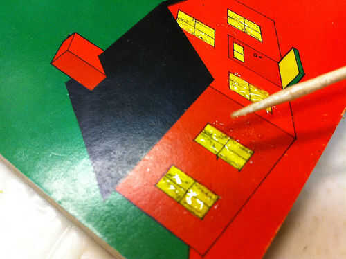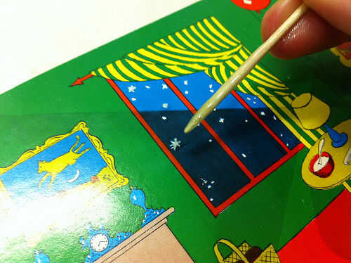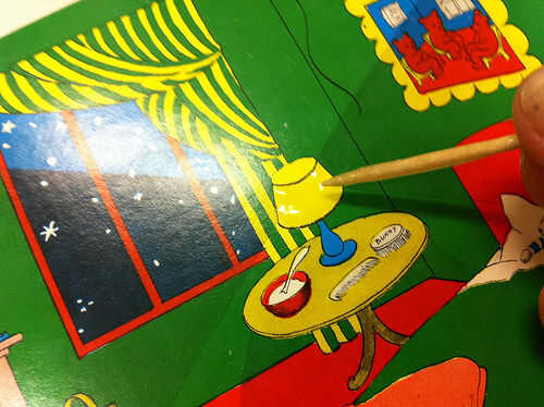 Usando un palillo de dientes o un pequeño cepillo desechable, pintar la mezcla de polvo brillo en las imágenes del libro que desea brillar. Tal vez usted querrá exponer los cuadros, o en los puntos de luz color, trazar las palabras, poner estrellas en el cielo, etc..