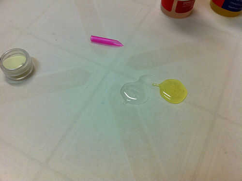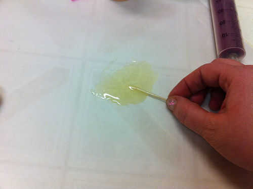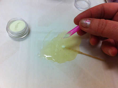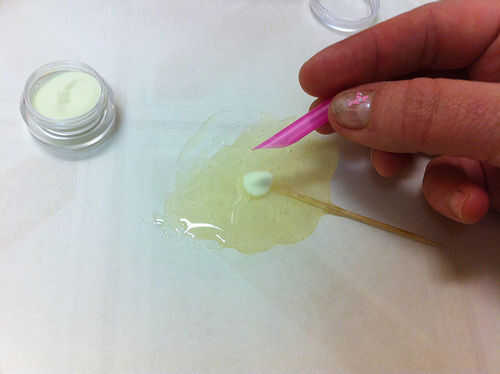 Sólo mezcle una pequeña cantidad de epoxi a la vez; Mezclé camino demasiado. Sólo podrás pintar una página abierta a la vez, tan solo mezclar suficiente epoxi para eso. Con un poco cortado de paja, sacar un poco de polvo resplandor y mezclarlo en el epoxi; Usted puede utilizar casi tanto polvo como tienes epoxy; no ir por la borda o el epoxy será demasiado polvo. Un poco va un largo camino con el polvo de buen brillo.