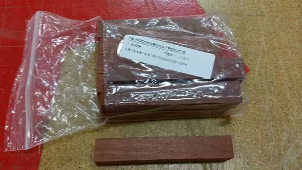 Compré la madera espacios en blanco de la pluma (5/8 "x 5/8" x 5") para ahorrar tiempo pero puedes usar tu propio. Para este proyecto he elegido Bloodwood, un palo de rosa rojo oscuro con un brillo iridiscente que realmente se ve muy bien contra el hardware de oro de 24 quilates. Es difícil pero astilla fácilmente así que áspero muy gradualmente para no partir la madera.