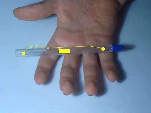 Taladre los orificios en la pluma en las formas y lugares se muestra en la imagen. Tenga cuidado de no perforar claro en ambos lados de la pluma, pero sólo en el lado más cercano a usted.
