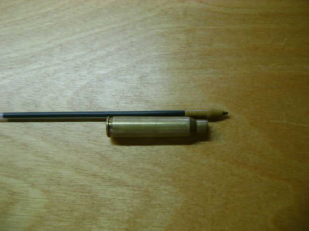 Primero saque el cartucho de pluma bic con los alicates. En segundo lugar desea alinear la punta de la cáscara de la bala con la pequeña muesca de la pluma como la primera foto. Corte el otro extremo de la pluma como la segunda foto. Luego ver si cabe.