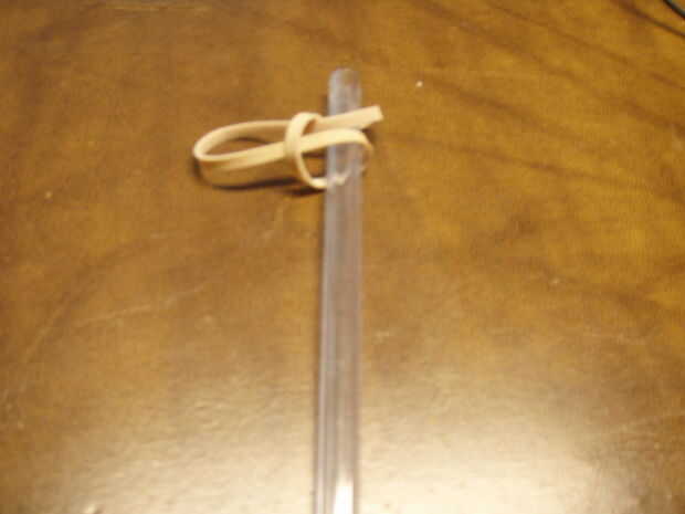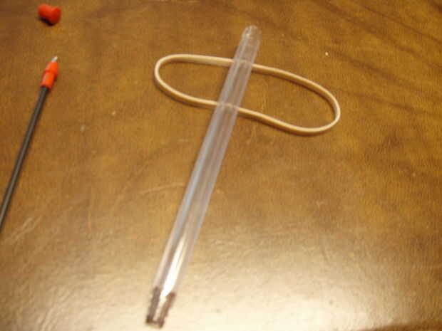 Desarmar la pluma. Luego atar la cinta de goma alrededor de un extremo, como se muestra.