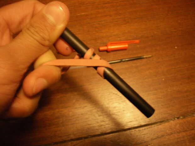 Envuelve el elástico como se muestra en la imagen, alrededor de la pluma. A continuación, inserte el acarreo de la tinta a través del tubo. Luego retire la banda elástica junto con el acarreo de tinta. Luego del fuego.