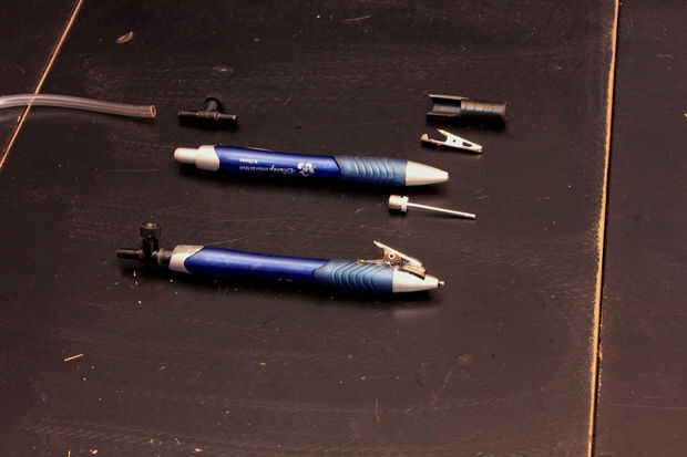 Los corrales que no conseguir demasiado específica aquí. Todo depende de lo que es su preferencia. Y aunque tenía un específico en mente, parece que cada vez encuentro plumas que me gusta dejan de venderlos todos modos. Me podría sugerir plástico ya que es más fácil trabajar con que el metal. Para mi gusto utilicé un lápiz más grueso con una empuñadura de goma porque me pareció más fácil de mantener, pero puede usar lo que se siente mejor para usted. Utilicé un bolígrafo clicker. Esto me permitió sacar el clicker al final para insertar la válvula de flujo de aire en lugar de cortar el final, pero que podría funcionar también. También, necesita un lápiz donde el cono de nariz tornillos apagado. Un bolígrafo que es uni-cuerpo sería mucho más difícil trabajar con pero es probablemente factible. Pero este recorrido se centrará en una pluma con un cono de nariz.