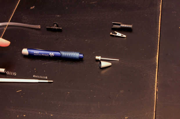 En primer lugar, desarmar su pluma. Necesitamos la tapa del Morro a fuera como este los hace.  Tomar el contenido de la pluma.  No necesitamos la parte de escritura realmente ni los muelles ni nada.  Sólo necesitamos el cuerpo de la pluma y el cono de nariz.