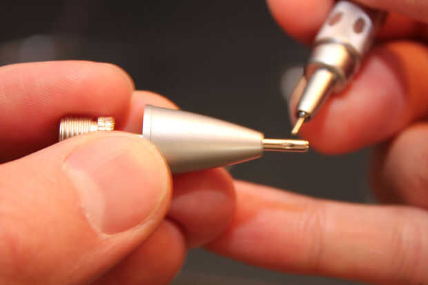 Mayoría de inflación de agujas tiene un agujero en el lado para asegurarse de que puede inflar el balón yo no quiero que va más allá de la punta del cono de nariz.  Realmente quiero sellado.  He visto unas agujas que no tienen ese agujero y si usted podría encontrar uno de los que sería mejor.  Pero aún podemos trabajar con esto.  Tengo algún juego entre el cono de la nariz y la aguja que quiero endurecer.  Tan en mi pluma que envuelto alrededor de una capa de cinta aislante para tapar el agujero y para obtener un calce en el cono de nariz. antes de pegar en.  O si usted no se preocupa por tener una abertura muy ligeramente más grande en el extremo de su pluma, su extremo cortado hacia fuera de la punta.