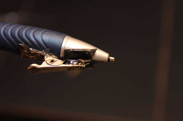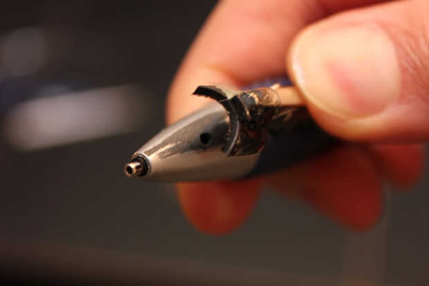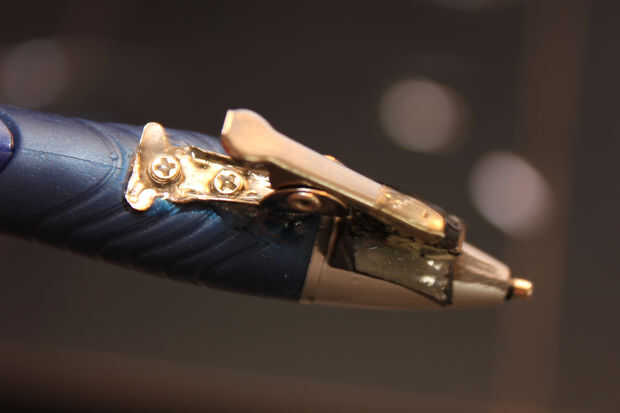 Utilice los dos tornillos pequeños para sujetar la pinza cocodrilo a la pluma. Solía de epoxy con el tornillo para asegurar un buen sello.