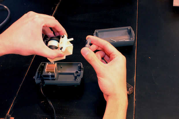 Cuando tire el tirón de la bomba lo hacia arriba.  Hay una cubierta gris sobre ambos las válvulas que vendrán con él.  Retire la tapa y ponga a un lado.