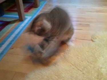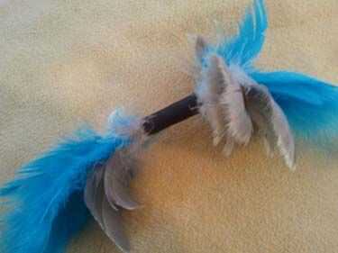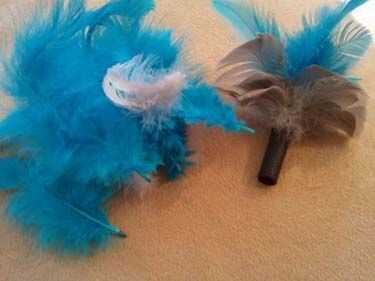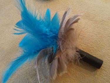 El concepto es el mismo - pegamento caliente mantiene en su lugar un montón de plumas. Empecé a poner un montón de plumas en un extremo, luego agregar el pegamento y pulsando otro montón de plumas en el otro extremo.