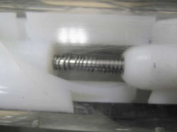 Otro problema que encontramos fue el efecto de las lagunas previstas entre la pared de la pluma y las levas en el hardware. El diámetro exterior de las cámaras fueron dados vuelta para que no exista fricción entre las levas y la pared como que se deslizó hacia arriba y hacia abajo. Sin embargo, este espacio dificultaba las levas permanecer concéntrica durante el movimiento del mecanismo. Para solucionar este problema hemos añadido una barra de guía (ver foto) entre las dos cámaras para mantener la concentricidad.